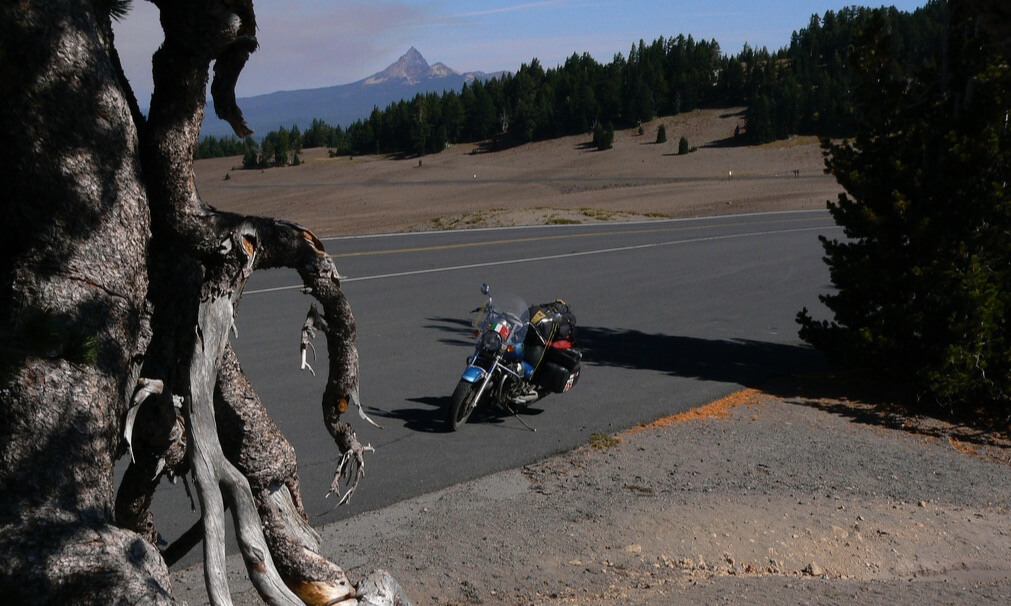 Riprendo la moto e attraverso l’unico ponte nella zona che consente di passare sopra il columbia entrando nello stato dell’Oregon, al pedaggio prendo il portafoglio e lo do direttamente alla casellante, tra guanti, moto e monetine sono impacciato e lento, la casellante replica che è illegale, allora glielo porgo tenendolo aperto nella mia mano. “Faccia lei” le dico, sorride e prende i 75 centesimi di dollaro americano che le spettano scavando tra monete, “loonie” e centesimi canadesi. Continuo per 400 km sino a entrare nel “Crater Park” a sud dell’Oregon, il sole sta scappando dietro le cime dei pini, punto esattamente in direzione “tramonto” perchè la strada numero 138 che percorro sembra volerlo infilzare come una freccia. Il tramonto pare un incendio propagato in ogni direzione, la linea dell’orizzonde si fa densa di un vapore rosso cangiante che svetta delle pinete sino al cielo sopra il cratere del vulcano. Assuefatto da tanto belvedere mi accorgo all’ultimo momento di un cerbiatto impalato in mezzo alla carreggiata, non si muove, e finalmente quando mancano solo 10 metri scappa verso la carreggiata opposta. Smaltisco l’adrenalina tornando a respirare dopo l’apnea, è il caso di trovarmi un posto per piantare la tenda. Ero convinto di raggiungere il campeggio di “Diamond Lake” ma a quanto pare è ancora troppo lontano.